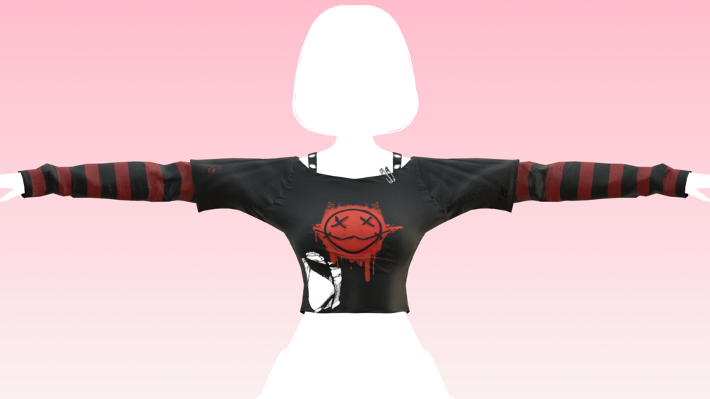 Long and short sleved layer top with rips and safety pin details! made in Marvelous Designer/Blender/Substance Painter by me! Modeled and weight painted to Zinfit (Not included)