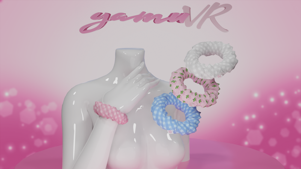A cute scrunchie for your wrist, made in Blender/Substance Painter by me! Rigged and modeled to Zinpia VRBASE Anime ver.(Not Included) but should be easy to WP on to any base :)