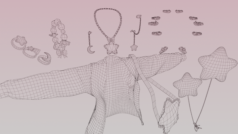 Earrings, Necklace, Cardigan, Bracelet, Rings, Nails, Balloons, and Bag all made in Marvelous Designer/Blender/Substance Painter by me! Rigged and modeled to Amelia AnimeHead and Zinfit Flat Foot Base (Not Included)